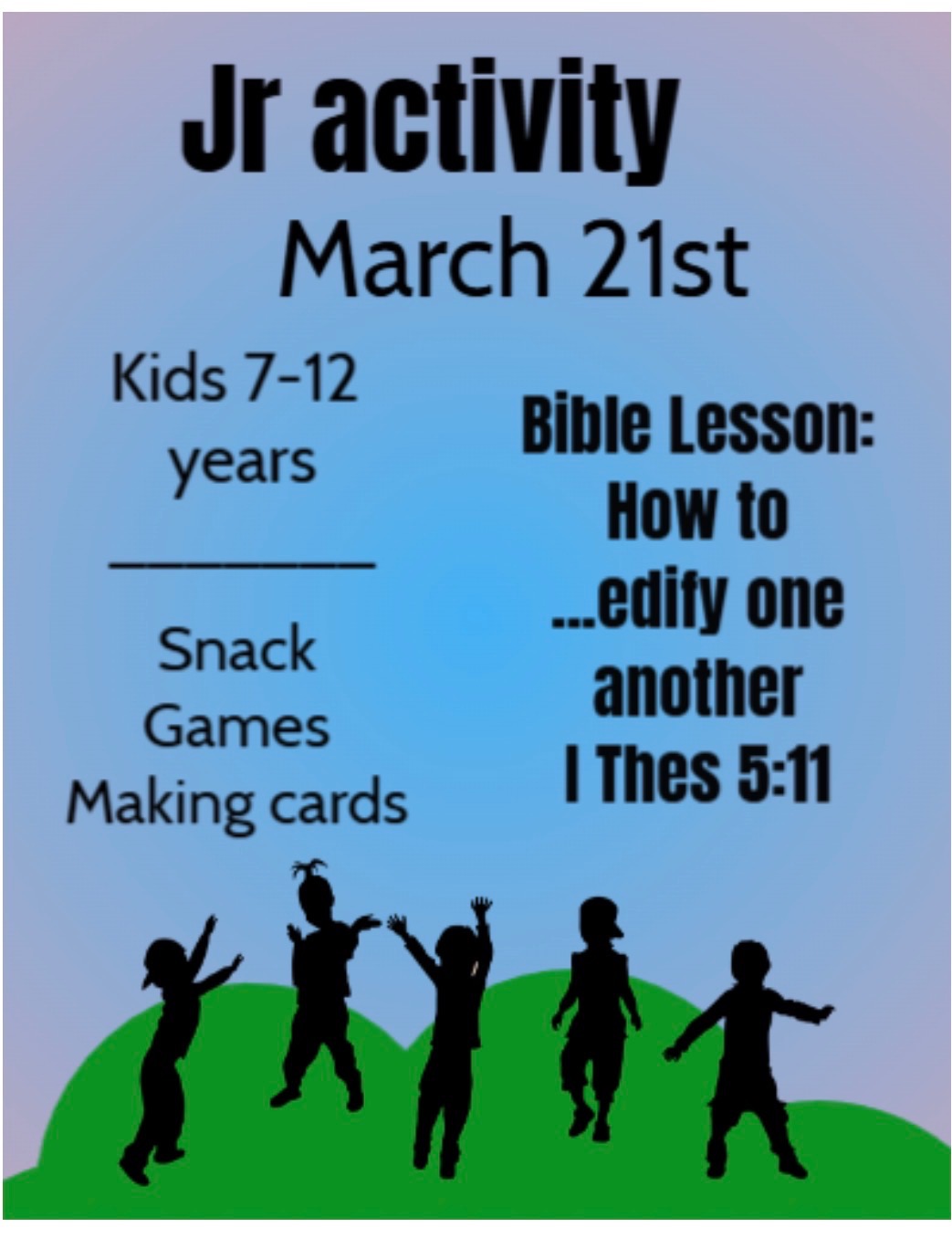 Ages 7-12. Come Out For A Time Of Fun And A Bible Lession